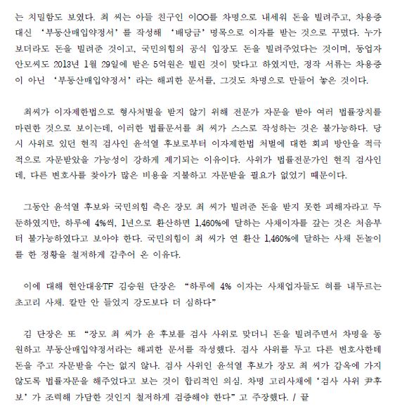 [보도자료] (더불어민주당 선대위 현안대응TF) 尹 장모 최 씨, 연 1,460% 살인적 차명 사채 돈놀이 정황