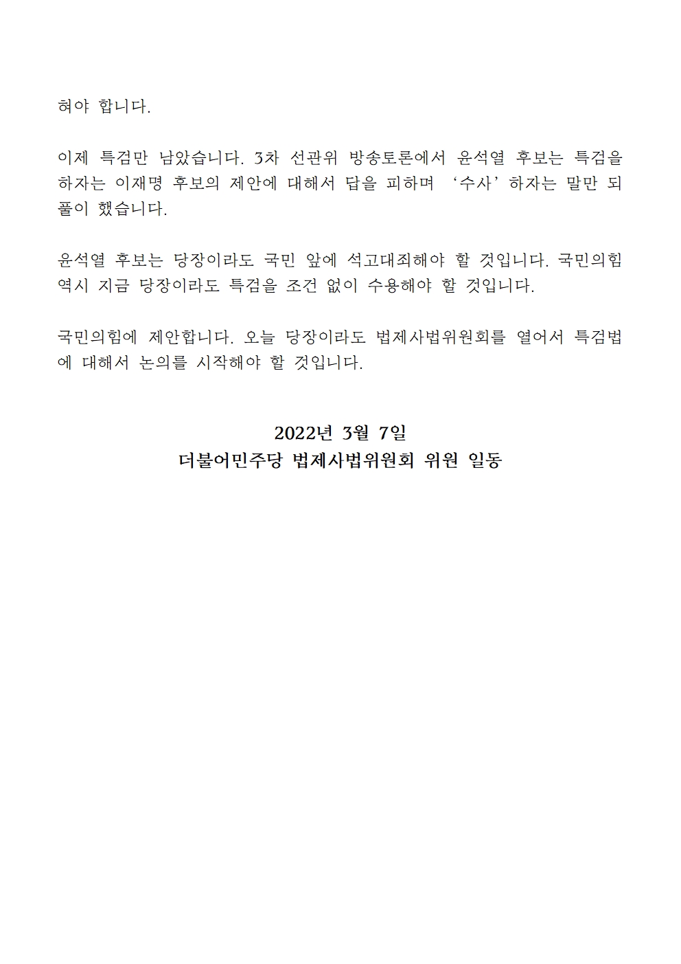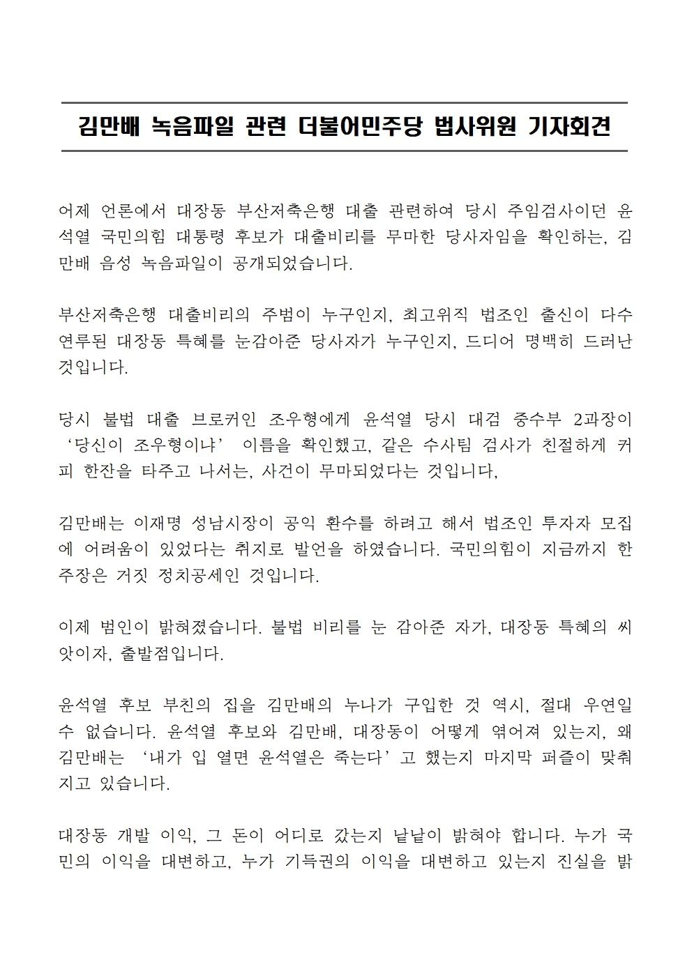 [기자회견문] 김만배 녹음파일 관련 더불어민주당 법사위원 기자회견