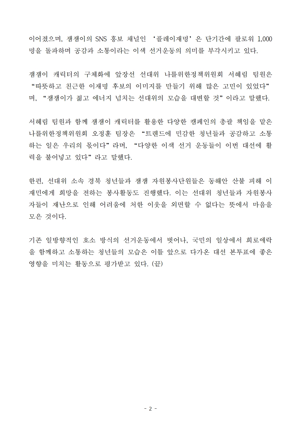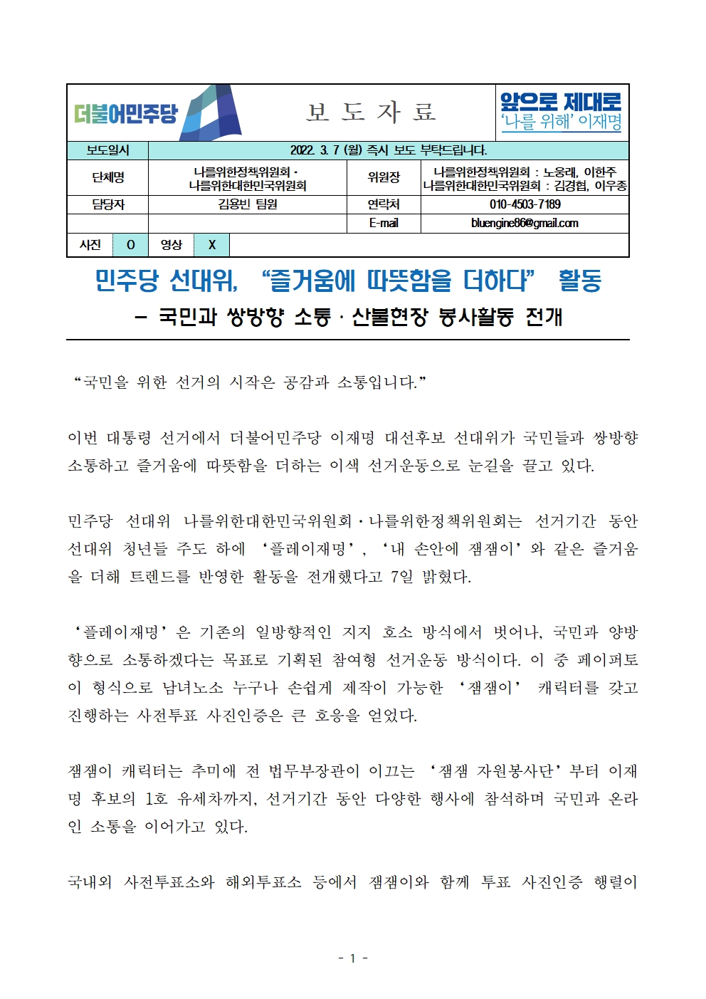 [보도자료] 더불어민주당 선대위 나를위한정책위원회·나를위한대한민국위원회, 국민과 쌍방향 소통·산불현장 봉사활동 전개