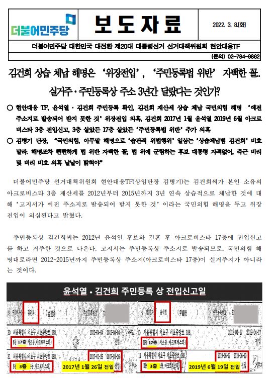 [보도자료] (더불어민주당 선대위 현안대응TF) 김건희 상습 체납 해명은 ‘위장전입’, ‘주민등록법 위반’ 자백한 꼴..실거주,주민등록상 주소 3년간 달랐다는 것인가?