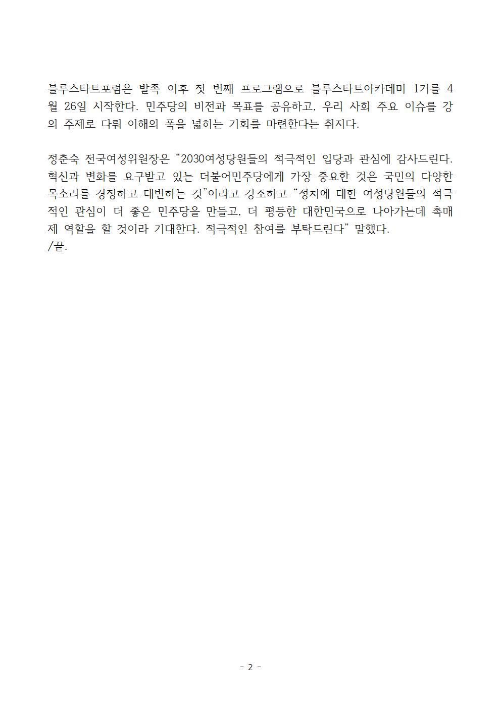 [보도자료] 더불어민주당 전국여성위원회, 블루스타트포럼 발족식 개최