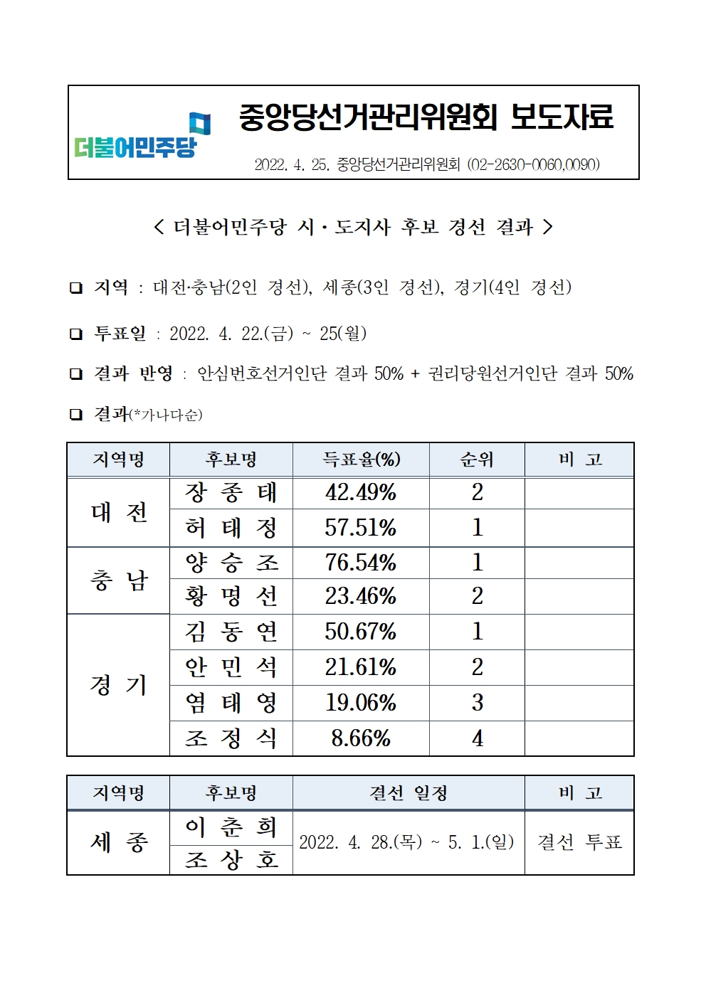[보도자료] 더불어민주당 중앙당선거관리위원회, 더불어민주당 시도지사 후보 경선 결과