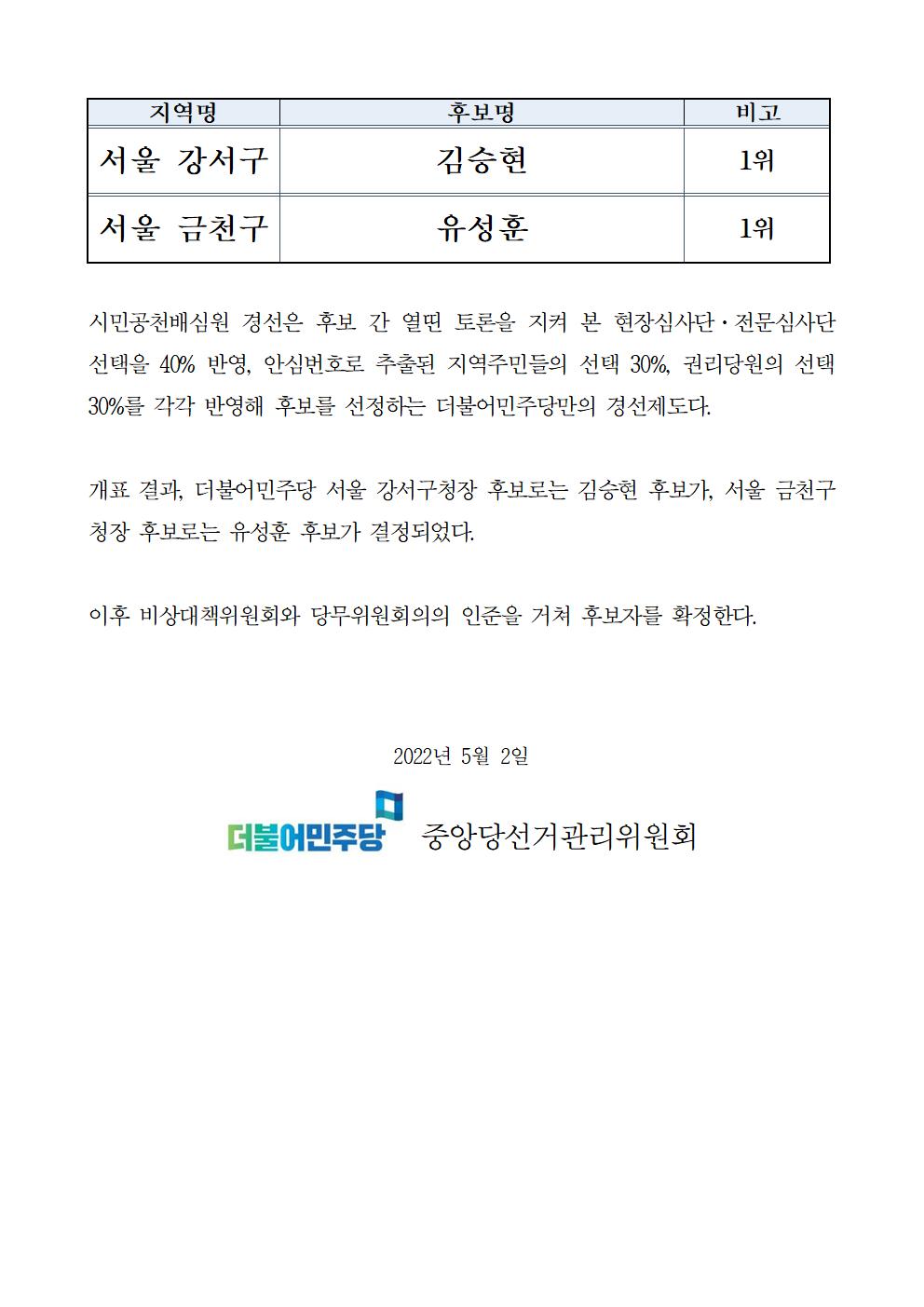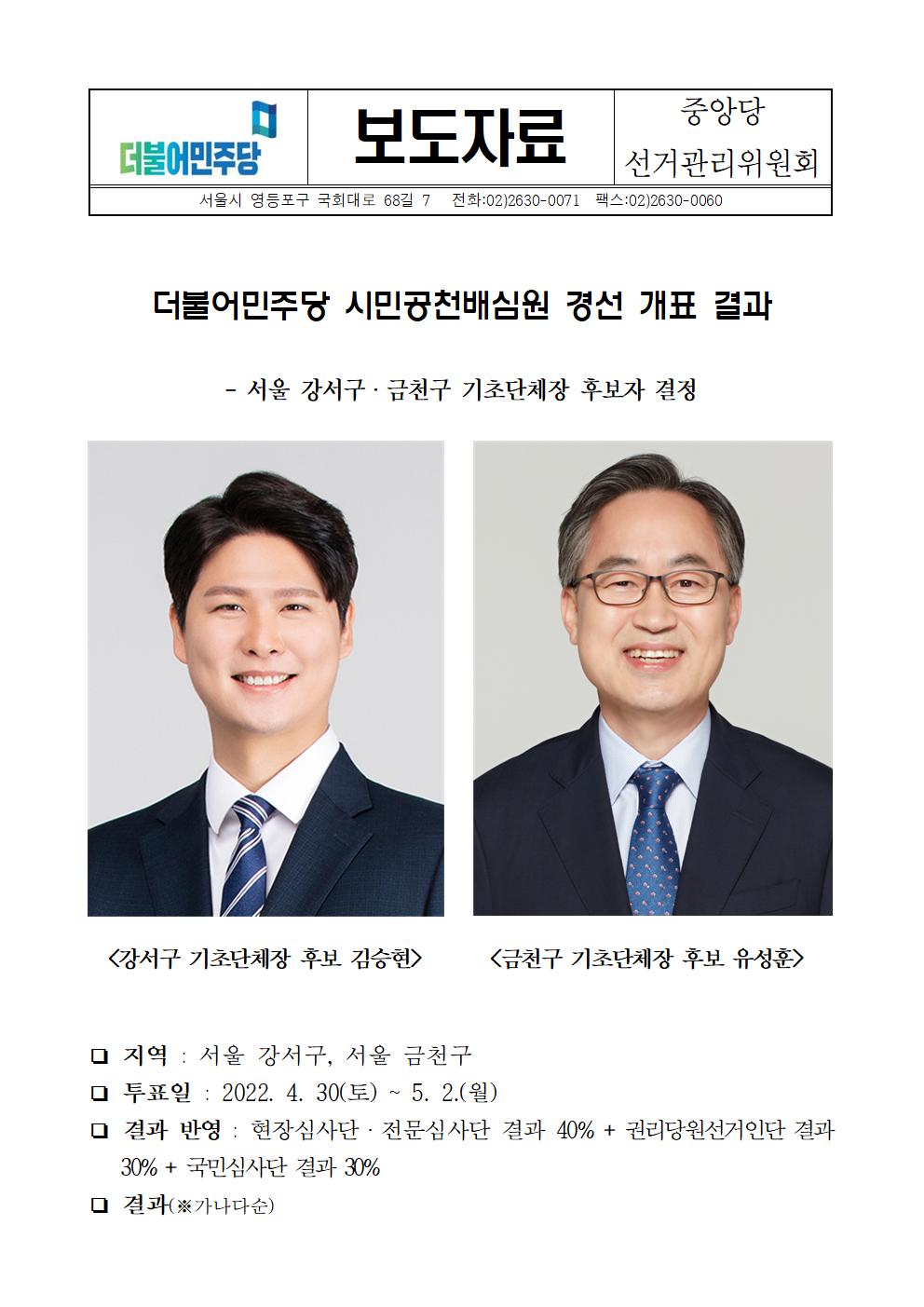 [보도자료] 더불어민주당 시민공천배심원 경선 개표 결과(서울 강서, 금천)