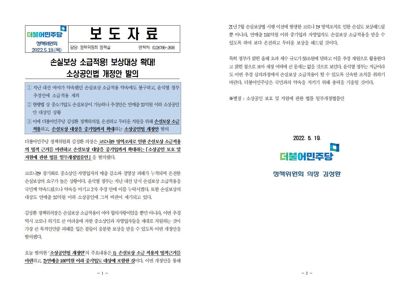 [보도자료] 더불어민주당 정책위원회, 손실보상 소급적용! 보상대상 확대! 소상공인법 개정안 발의
