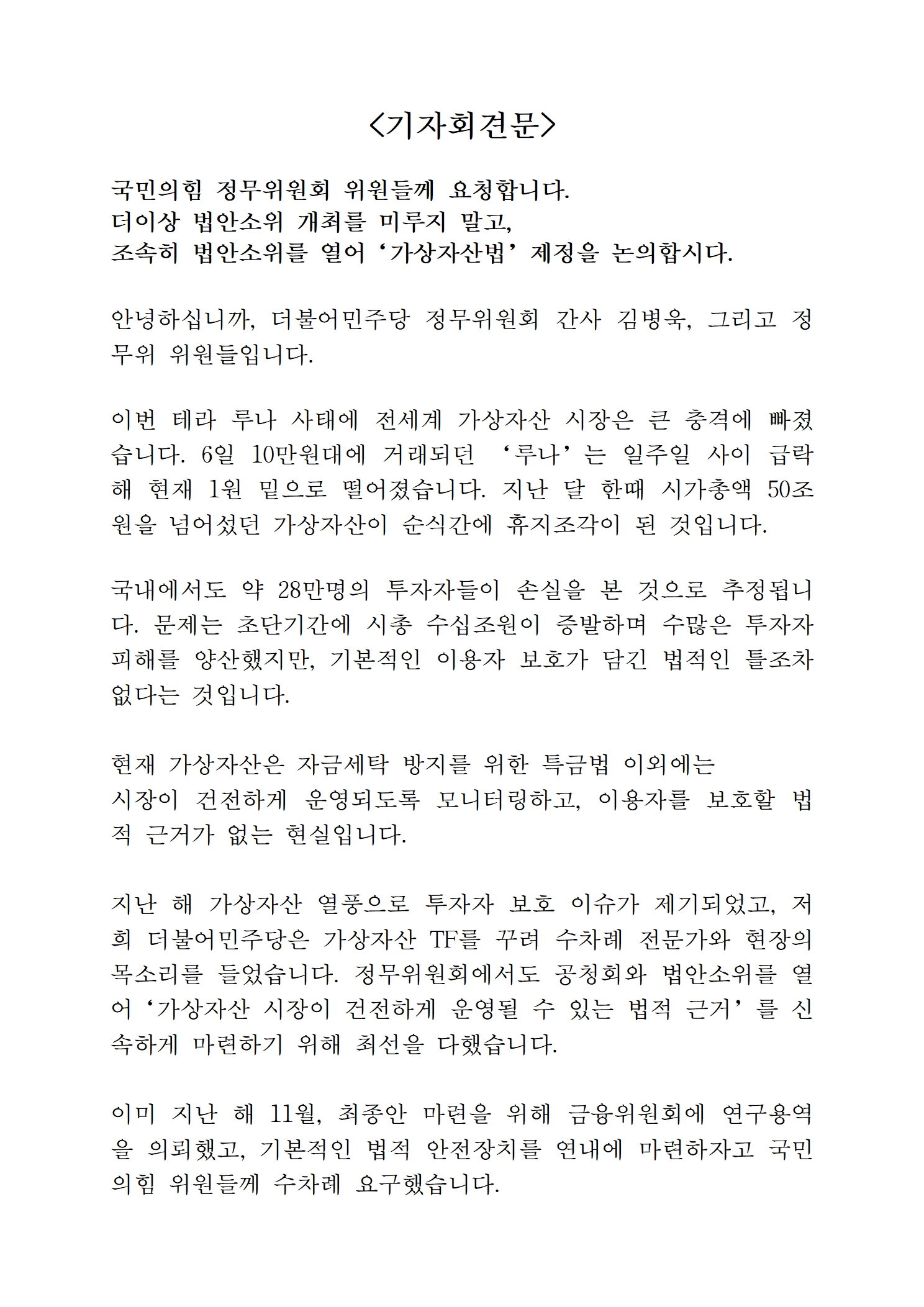 [기자회견문] 더불어민주당 정무위원회 위원, 가상자산업권법 제정 촉구