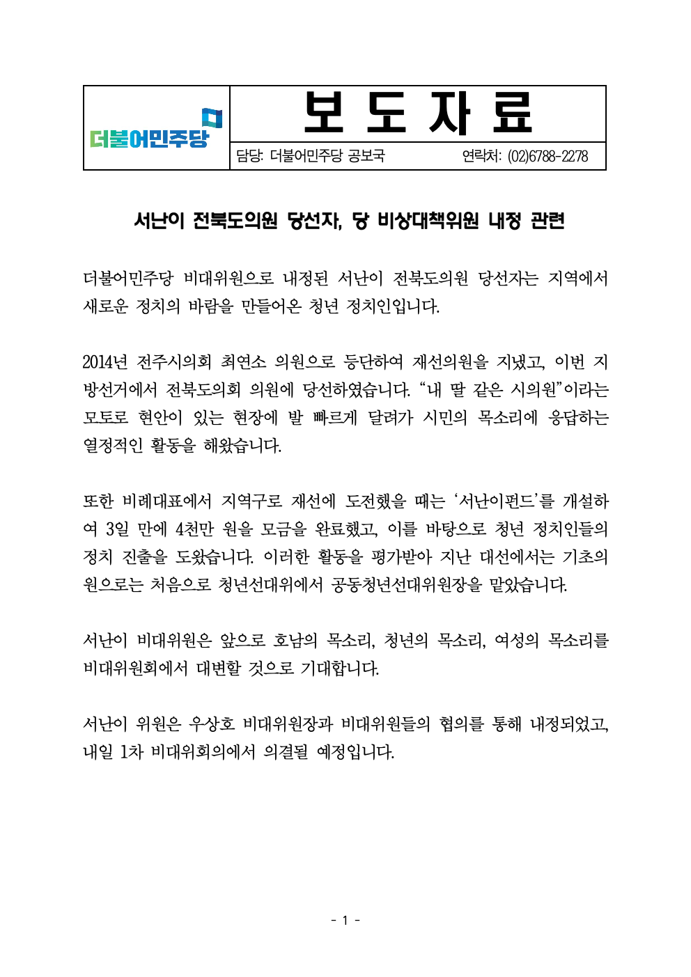 [보도자료]서난이 전북도의원 당선자 비상대책위원 내정 관련