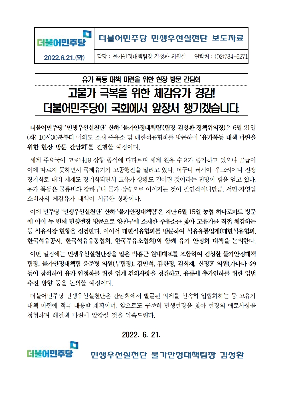 [보도자료] 더불어민주당 민생우선실천단, 유가 폭등 대책 마련을 위한 현장 방문 간담회