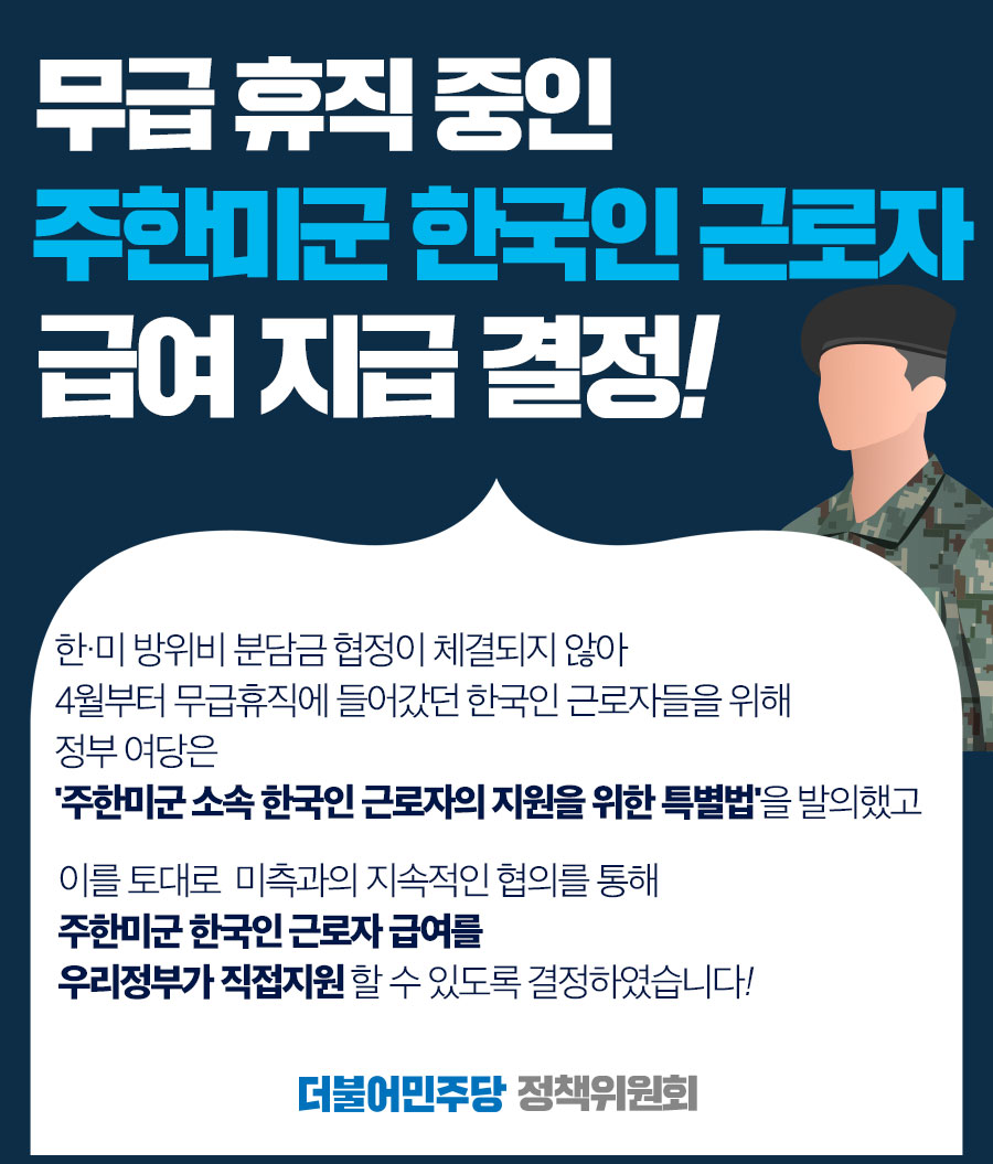 무급 휴직 중인 주한미군 한국인 근로자 지원금 지급 결정!