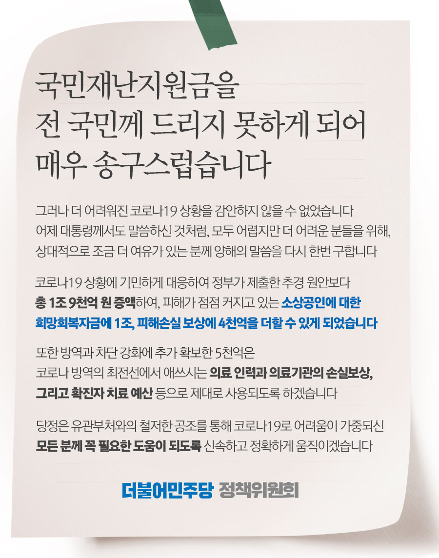 국민재난지원금을 전 국민께 드리지 못하게 되어 매우 송구스럽습니다.