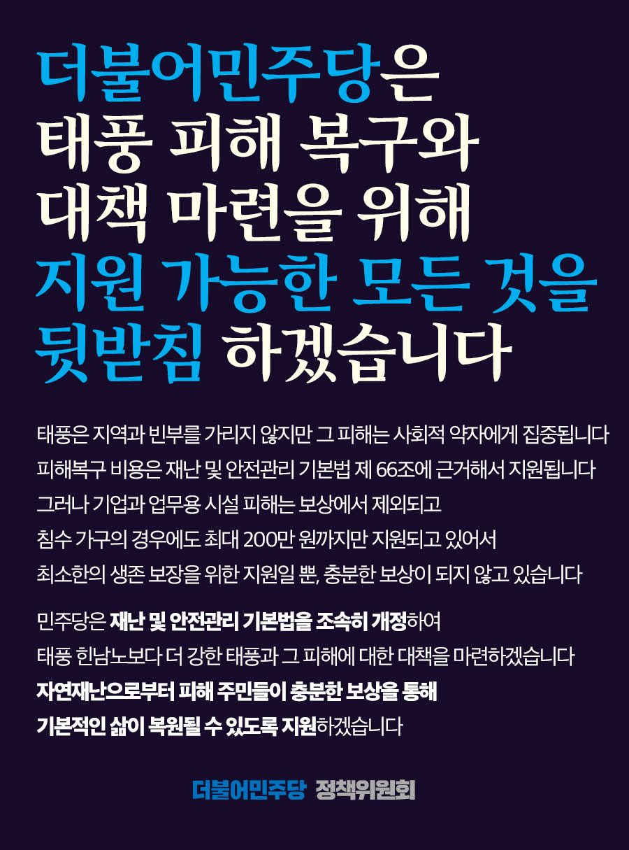 더불어민주당은 태풍 피해 복구와 대책 마련을 위해 지원 가능한 모든 것을 뒷받침 하겠습니다!