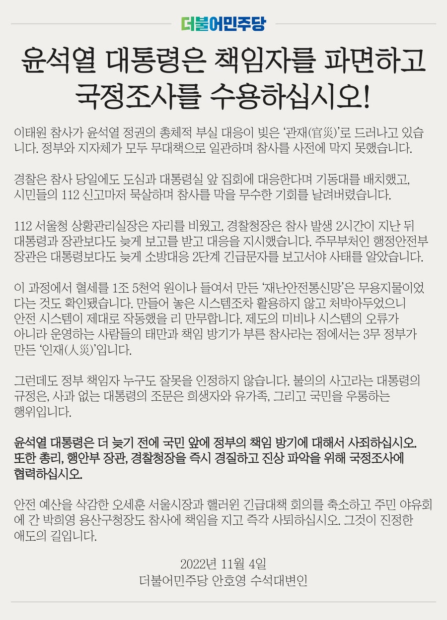 윤석열 대통령은 책임자를 파면하고 국정조사를 수용하십시오!