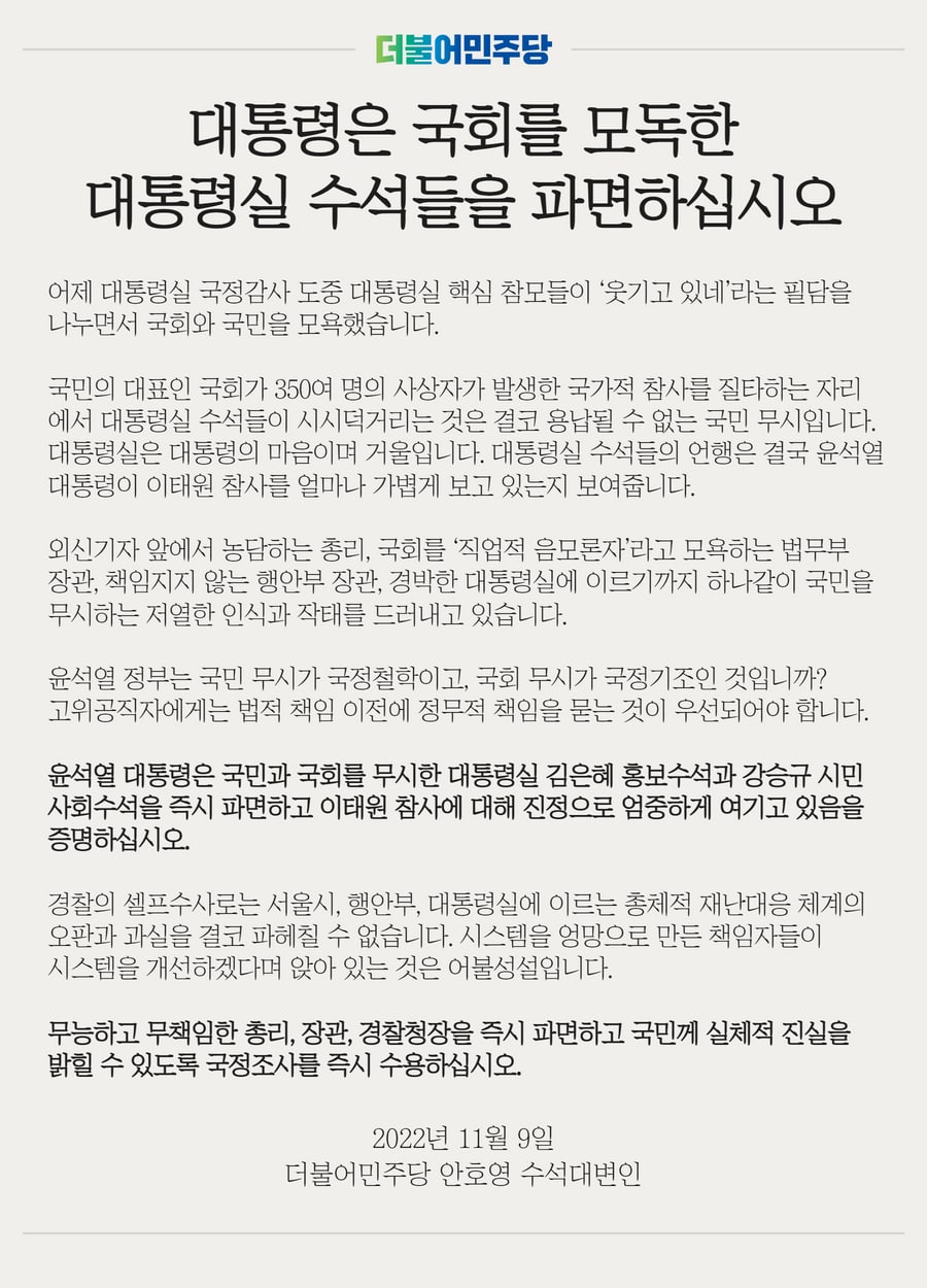 대통령은 국회를 모독한 대통령실 수석들을 파면하십시오