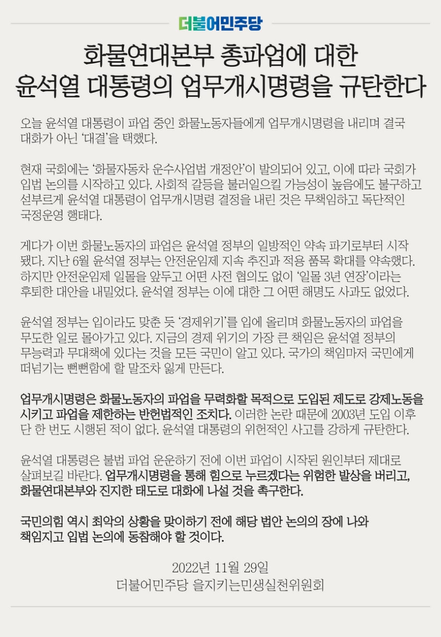 화물연대본부 총파업에 대한 윤석열 대통령의 업무개시명령을 규탄한다