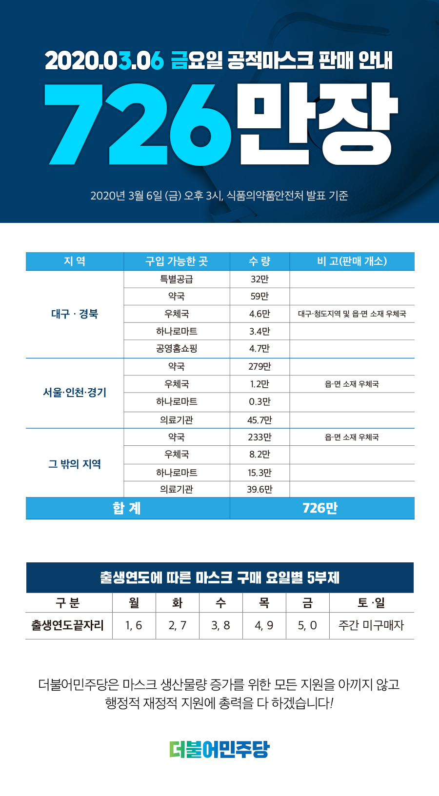3월 6일 공적마스크 "726만장" 공급!