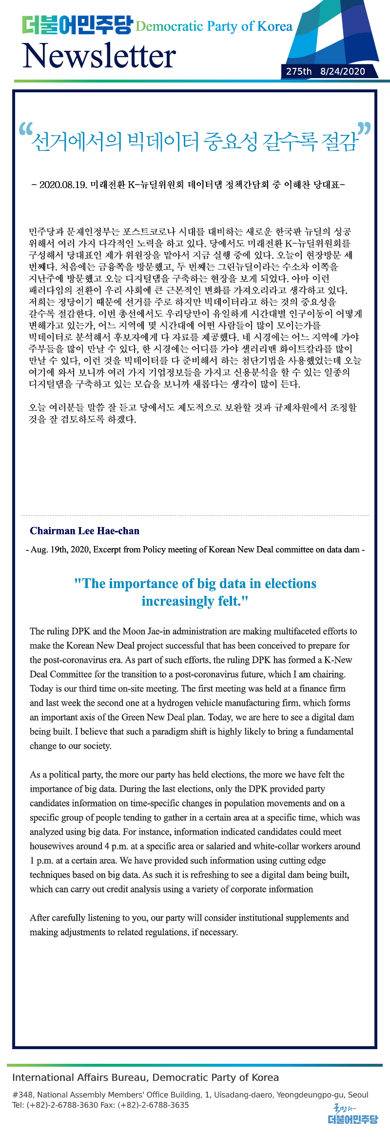 [275th Newsletter] Excerpt from Policy meeting of Korean New Deal committee on data dam