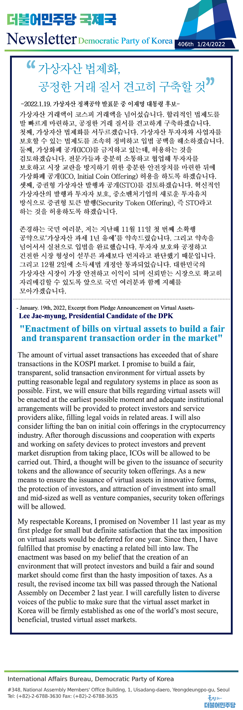 [406th Newsletter]Excerpt from Pledge Announcement on Virtual Assets