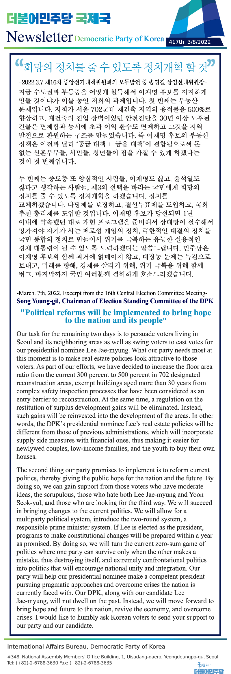 [416th Newsletter]Excerpt from the meeting of the DPK’s special committee for political reforms