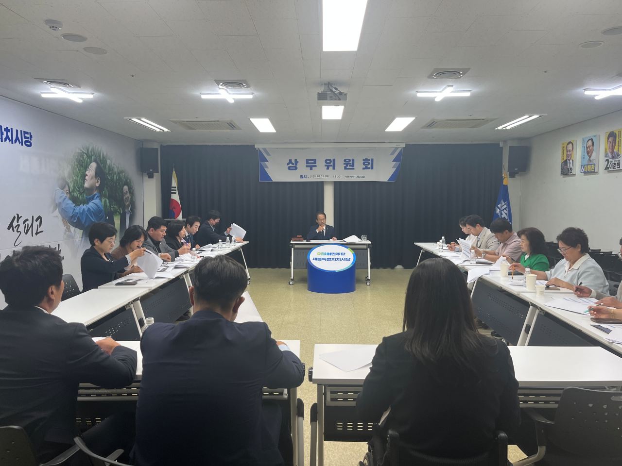 세종시당 제7차 상무위원회 개최 일시 : 2025년10월01일(수) 18:30 / 장소 : 세종시당 대회의실 / 참석 : 시당위원장 외 16명 / 안건 : 창당 70주년 2급포상의 건 의결 등.