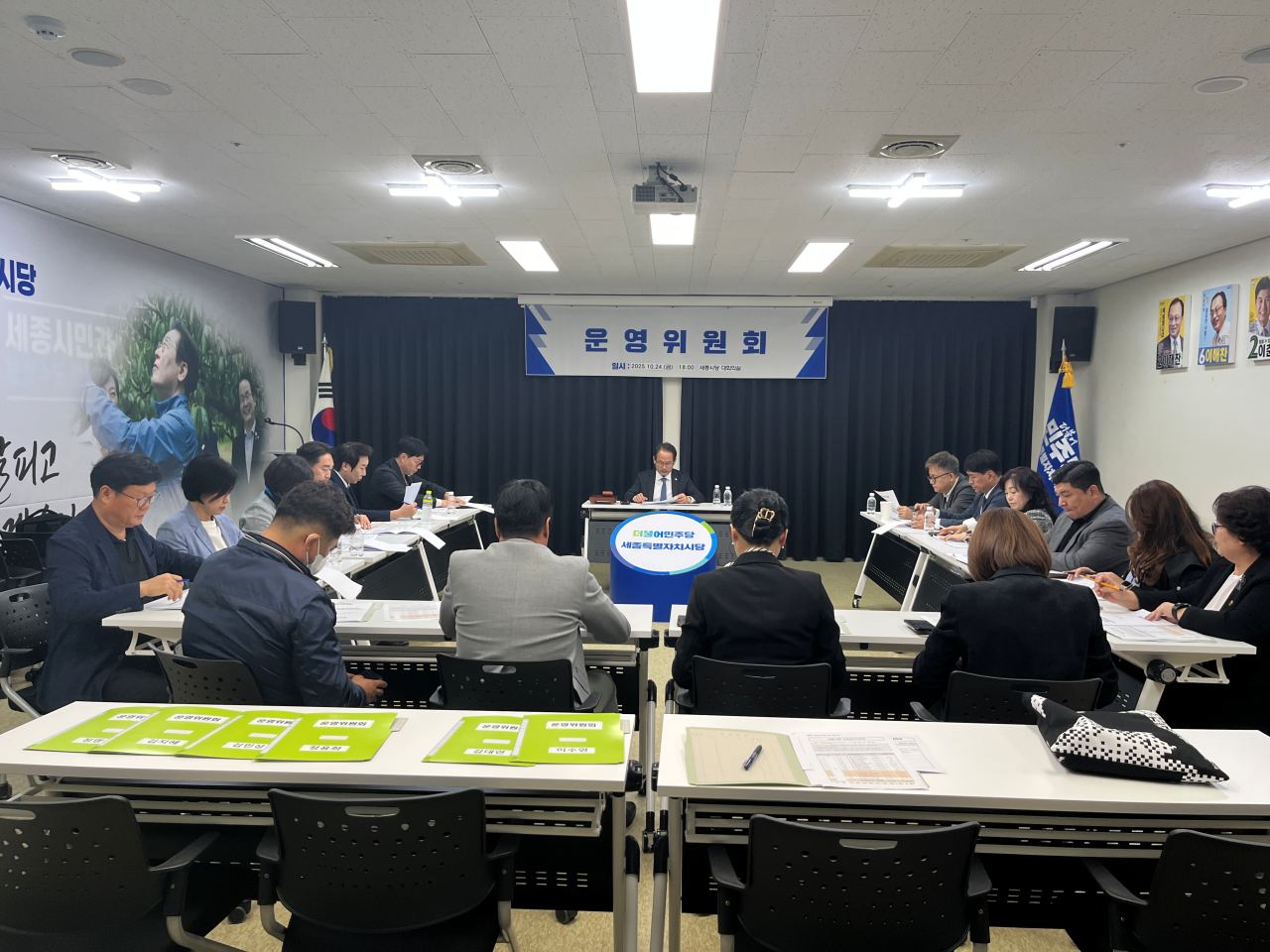 세종시당 제8차 운영위원회 개최 일시 : 2025년10월01일(수) 18:00 / 장소 : 세종시당 대회의실 / 참석 : 시당위원장 외 13명 / 안건 : 창당 70주년 2급포상의 건 의결 등.