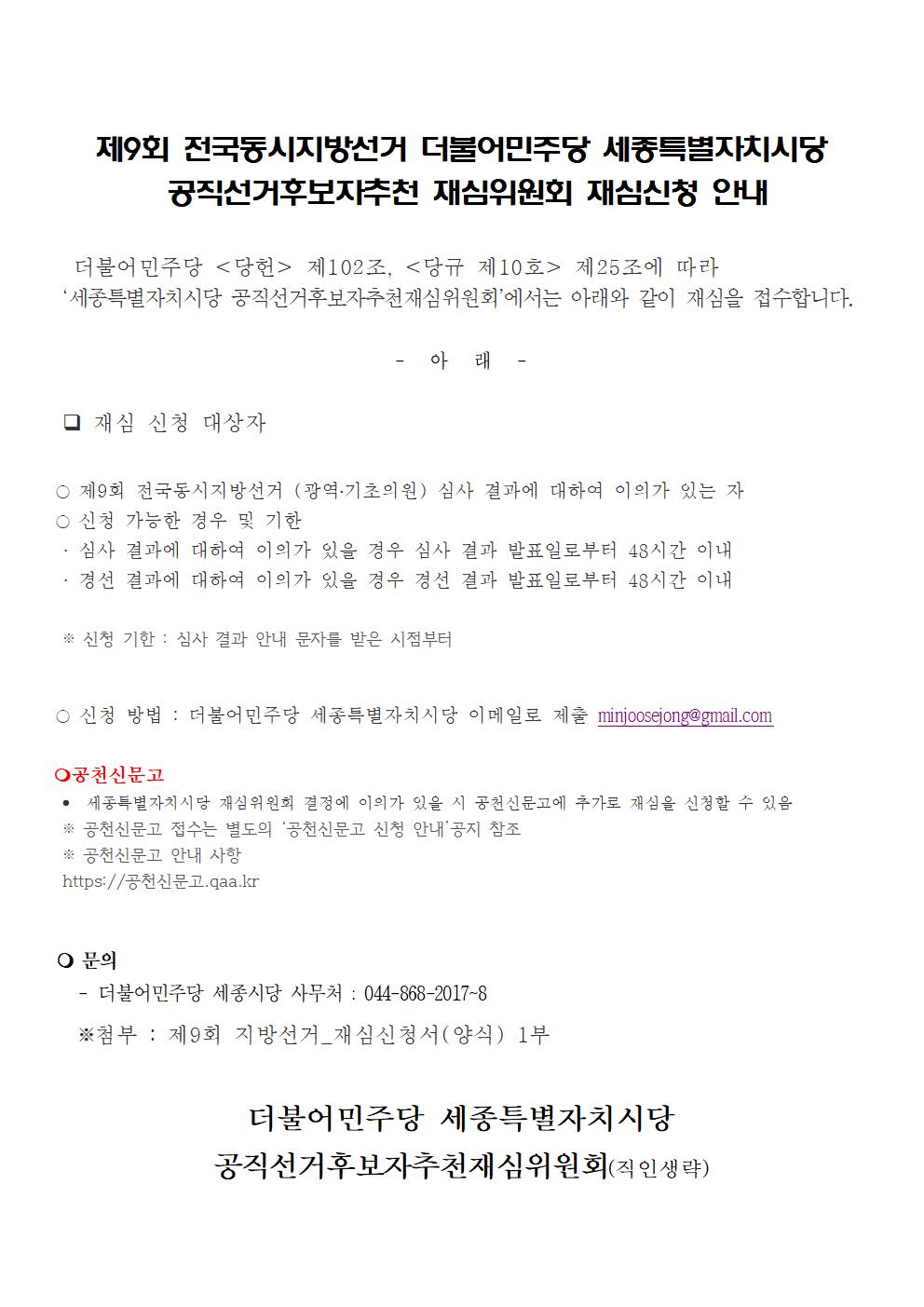 신청 방법 : 더불어민주당 세종특별자치시당 이메일로 제출 minjoosejong@gmail.com